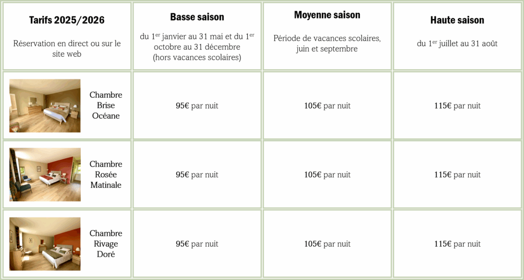 Nos prix s’entendent toutes taxes comprises (TVA et taxe de séjour), petit déjeuner inclus. Les conditions, tarifs, et offres non contractuelles sont susceptibles d’être modifiés sans préavis.